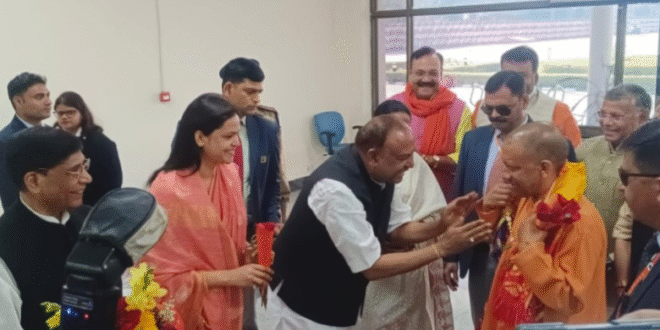 एयरपोर्ट पर सीएम योगी के पैर छूने को दौड़े मंत्री और विधायक