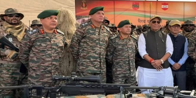 रक्षा मंत्री राजनाथ सिंह ने शुक्रवार (24 अक्तूबर) को राजस्थान के पश्चिमी मोर्चे पर लौंगेवाला युद्धक्षेत्र में सैनिकों के साथ बातचीत की। राजनाथ सिंह ने लौंगेवाला युद्धभूमि का दौरा किया और वहां आयोजित ‘थार शक्ति अभ्यास’ के दौरान सैनिकों से संवाद किया। राजनाथ सिंह ने भारतीय सेना की नई गठित ‘भैरव बटालियन’ के जवानों से भी भेंट की।